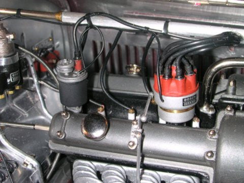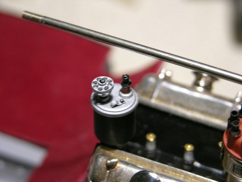 An exact scale replica of the Magneti Marelli large diameter ingnition coil seen on Alfa 8c 2300 and Scuderia Ferrari 8C 2600 engines of Thirties. Correct down to the separate bronze replica of the ceramic insulator.