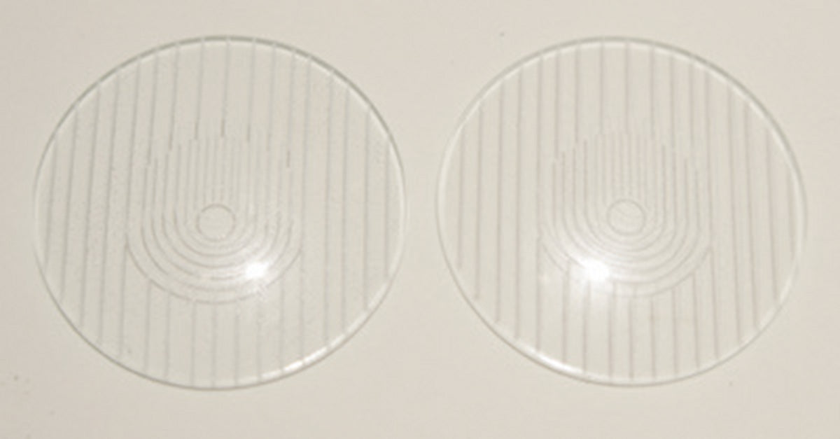 Hand cut, beveled and polished from watch grade 1 mm tempered glass from Germany. Includes decals to simulate the reflex pattern. And, yes...they are convex just as the prototype! (Sold in pairs)