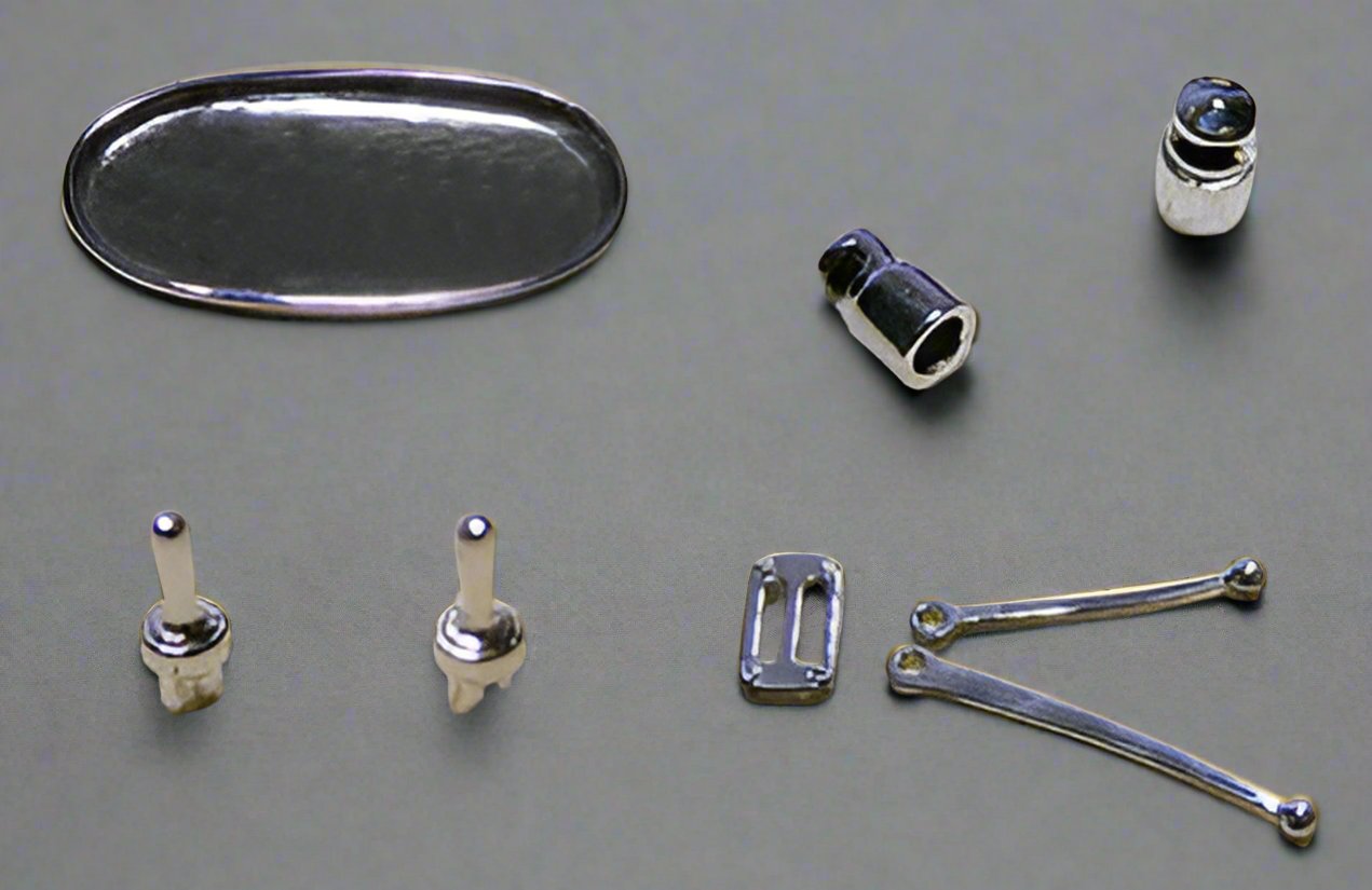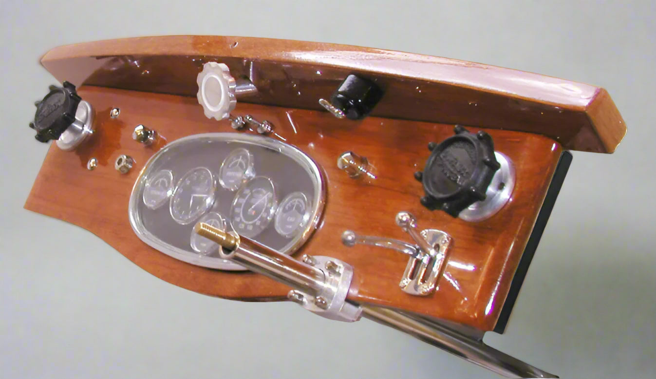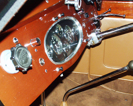 This wonderful dash was made by Frank Giordano and shows our new parts; The Instrument Cluster, Gate and Levers, Light Housings and Switches. They are all cast in bronze and plated. Requires some modification to the Pocher dash, or, why not build your own out of cherry wood? The Instrument Cluster will require using our Gauge Faces, Lenses and Bezels (B011). The Light Housings are hollow to accommodate the bulb and slotted for the light. Ensemble is sold as a set or as individual parts. (Sold by the set)