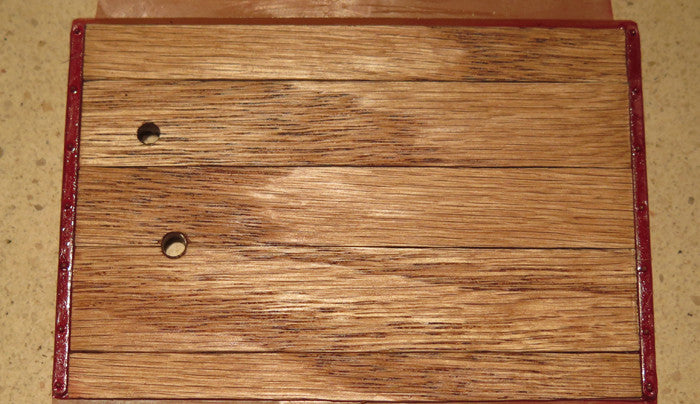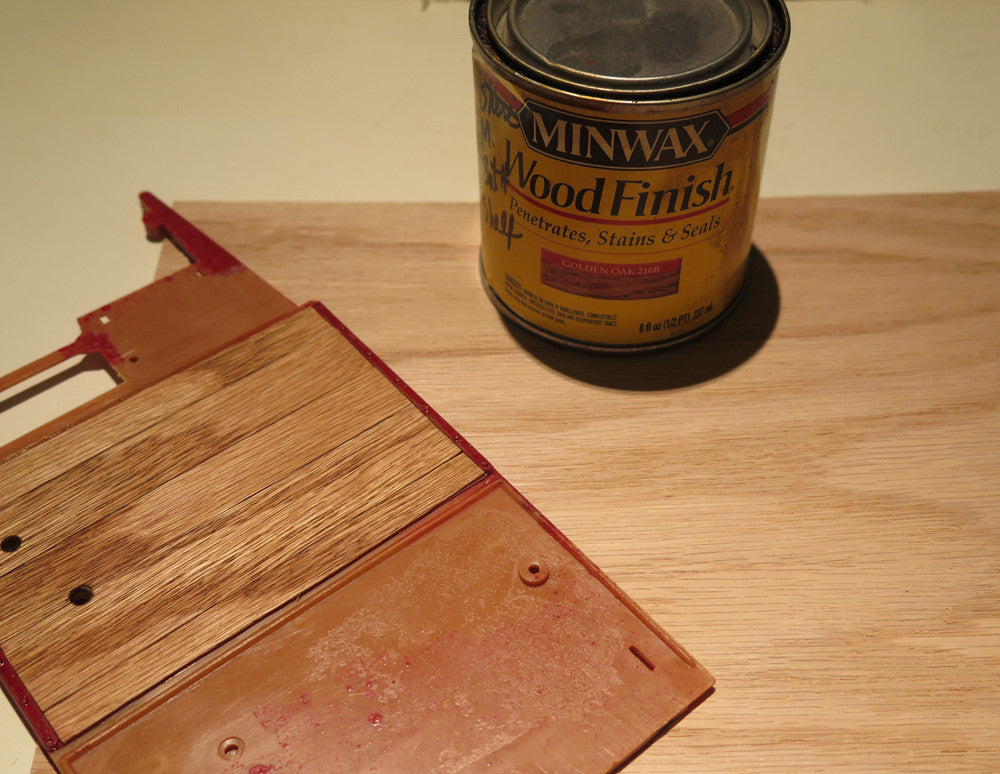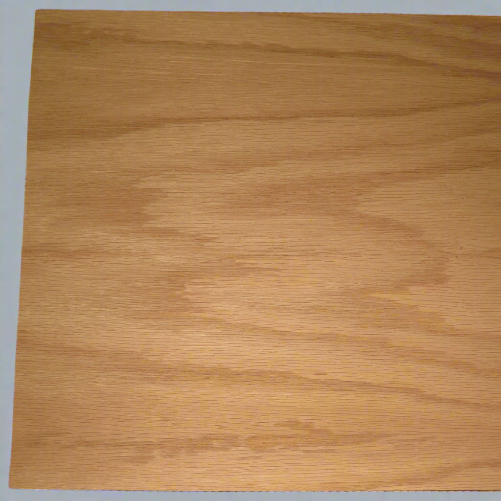 Real veneer (red oak), pressure sensitive adhesive...just measure and cut with a scissor. We used Minwax Wood Finish - Golden Oak for the final finish. Perfect match with the prototype as shown. Approximately 8" square...enough for any mistakes!