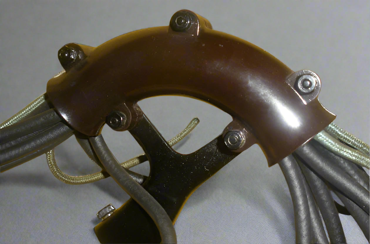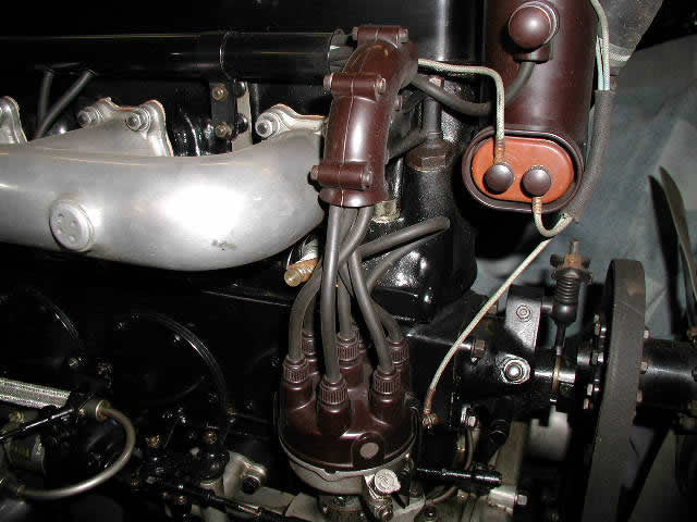 Cast in resin; the spark plug wires coming from the distributor are gathered into this elbow and redirected 90 degrees to the sparkplug loom itself. The first picture shows our part before painting. The fourother photos show the actual part during restoration (pic #2) and installed in the engine compartment of a PII (pics 3 and 4). (The last picture is the elbow loom installed in the engine of King George VI's parade car.)