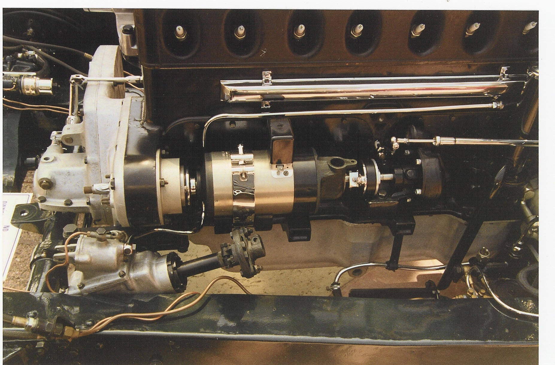 Cast bronze, nickel plated, rectangular strip, mounts to engine. Cast with the holes for the wiring.