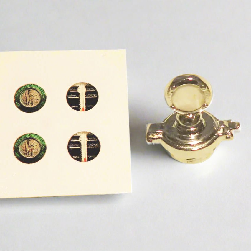 Threaded to fit the Pocher radiator fitting and includes two printed inserts, one the temperature gauge face and one a St. Christopher's medal for good luck.