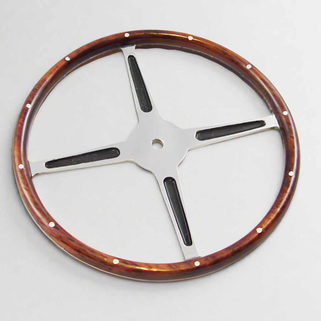 Our Steering Wheels were unavailable for years but now, thanks to the latest technologies, we are proud to be able to once again offer our famous Steering Wheels in Maple, Walnut and Mahogany.The spokes are machined from .40 stainless steel using a pantograph and hand assembled with aluminum pins. Then finished with three coats of polyurethane.