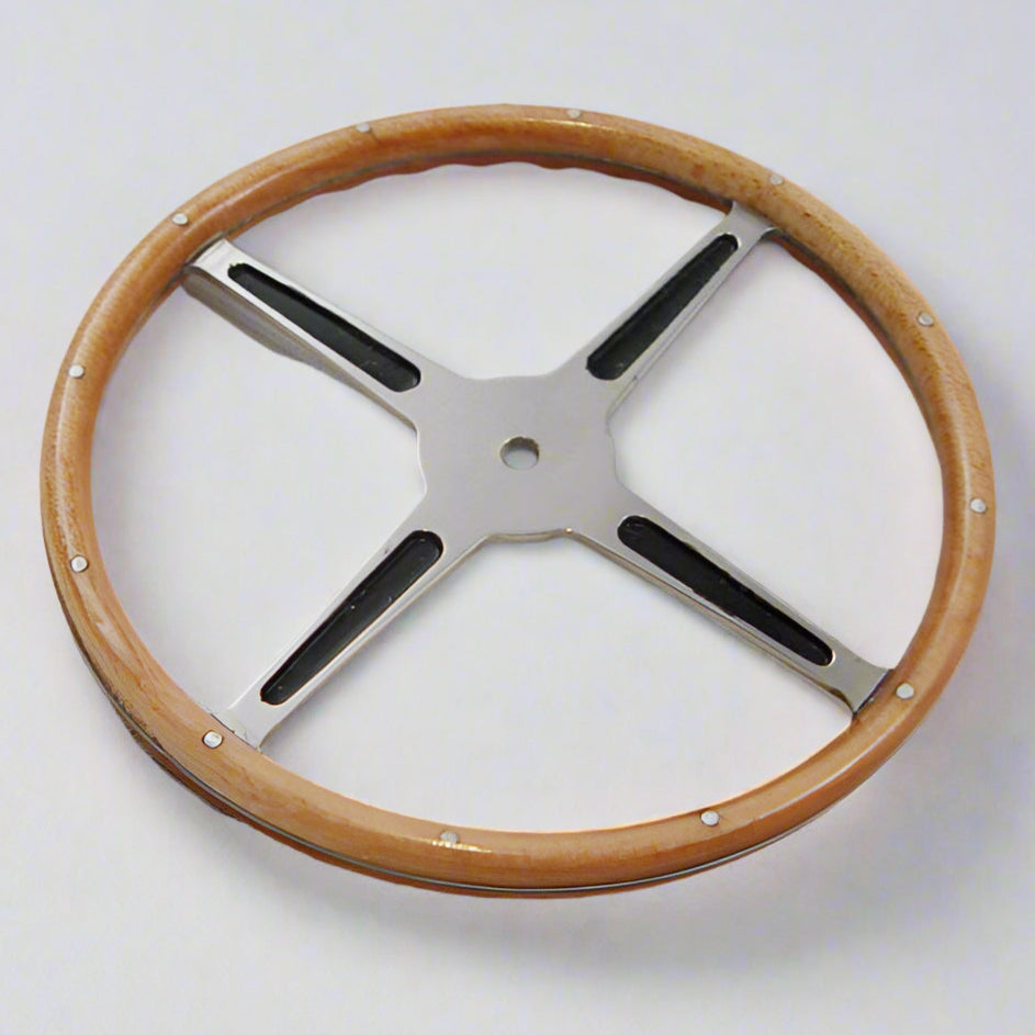 Our Steering Wheels were unavailable for years but now, thanks to the latest technologies, we are proud to be able to once again offer our famous Steering Wheels in Maple, Walnut, Oak and Mahogany.The spokes are machined from .40 stainless steel using a pantograph and hand assembled with aluminum pins. Then finished with three coats of polyurethane.